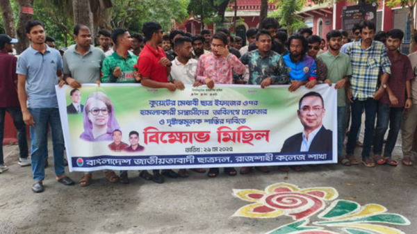নিজস্ব প্রতিবেদক : খুলনা প্রকৌশল ও প্রযুক্তি বিশ্ববিদ্যালয়ের (কুয়েট) মেধাবী ছাত্র ইফাজের ওপর বর্বরোচিত হামলার প্রতিবাদে রাজশাহী কলেজ শাখা ছাত্রদলের উদ্যোগে এক বিক্ষোভ মিছিল অনুষ্ঠিত হয়েছে। বৃহস্পতিবার সকাল ১১টা ৪৫ মিনিট ...বিস্তারিত পড়ুন