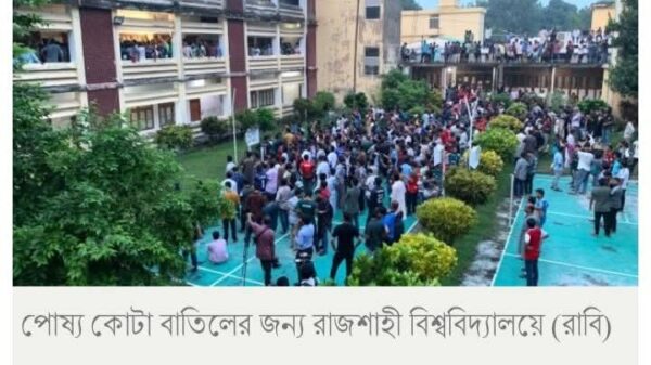 নিজস্ব প্রতিবেদক, রাবি: রাজশাহী বিশ্ববিদ্যালয়ে (রাবি) প্রথম বর্ষের ভর্তি পরীক্ষায় পোষ্য কোটা পুনর্বহালের সিদ্ধান্তের প্রতিবাদে গতকাল বৃহস্পতিবার রাতে সাড়ে চার ঘণ্টা অবস্থান কর্মসূচি ও বিক্ষোভ করেন শিক্ষার্থীরা। রাত সাড়ে ১১টার দিকে
